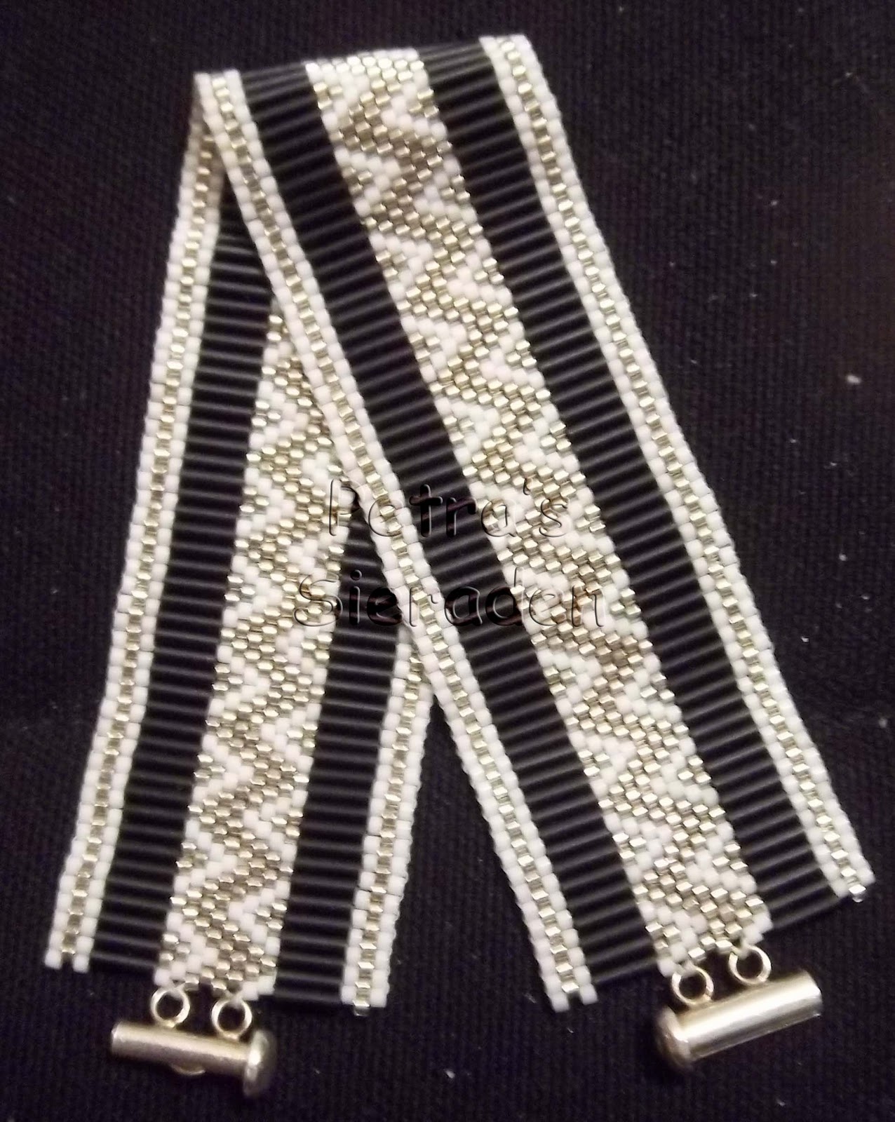 Of het nu komt door de kleuren die ik gebruikt heb of door het patroon, dat weet ik eigenlijk niet, ik vind het in ieder geval een beetje in een "Indianen stijl", vandaar dat ik hem gemakshalve maar eventjes "IndiStyle" genoemd. De armband is gemaakt van Miyuki Delica's en Miyuki Bugles in een Peyote steek. Aangezien ik het wel altijd heel leuk vind om sieraden te hebben die bij elkaar passen heb ik ervoor gekozen om in dezelfde kleuren en met dezelfde materialen een bijpassende Hanger te maken.